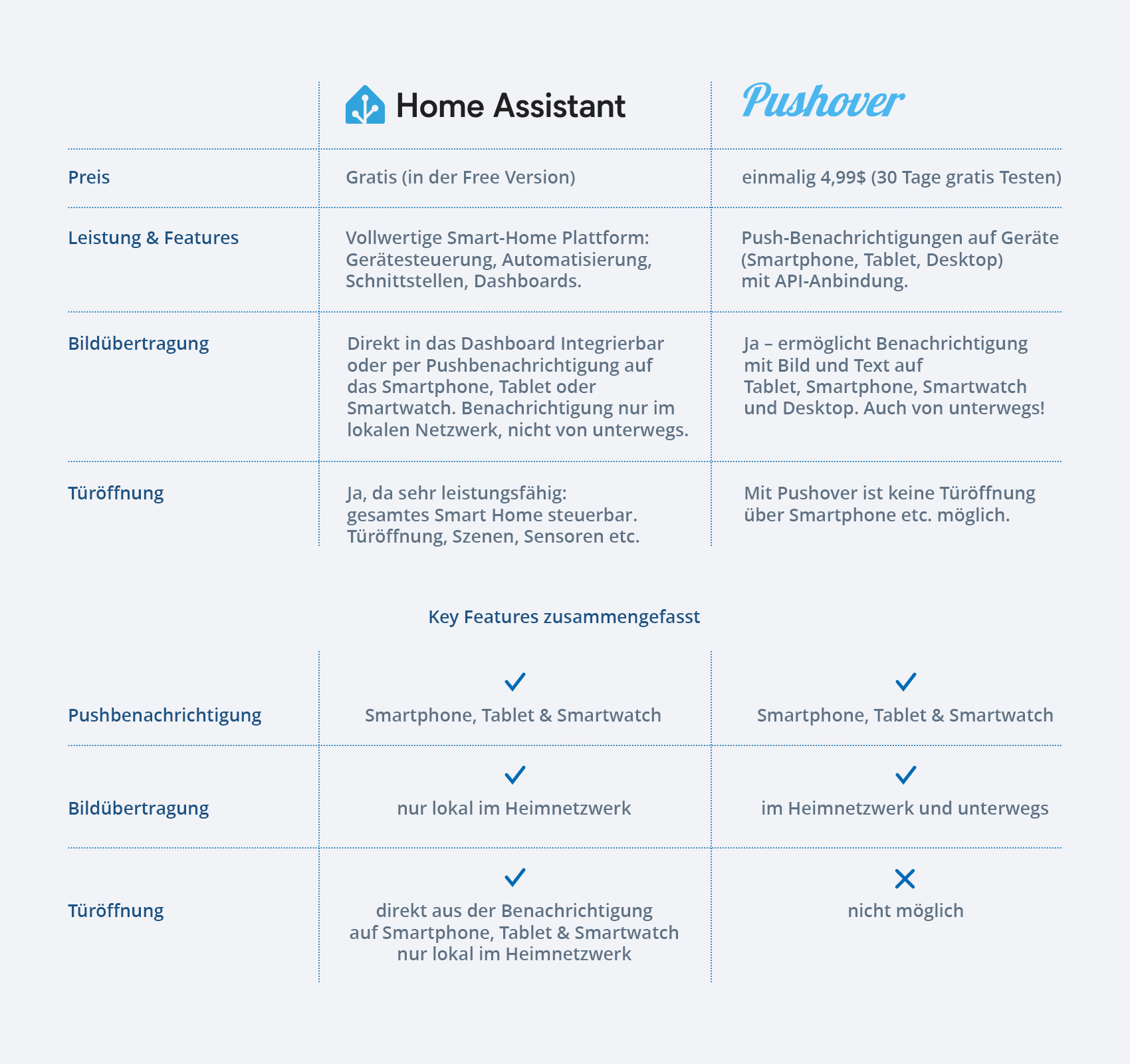 Erhalten Sie Pushnachrichten mit Bild direkt auf Ihr Smartphone, Tablet oder Ihre Smartwatch! Egal ob zuhause oder unterwegs. Mit der Integration in Home Assistant oder Pushover wissen Sie immer, wer vor der Tür steht.