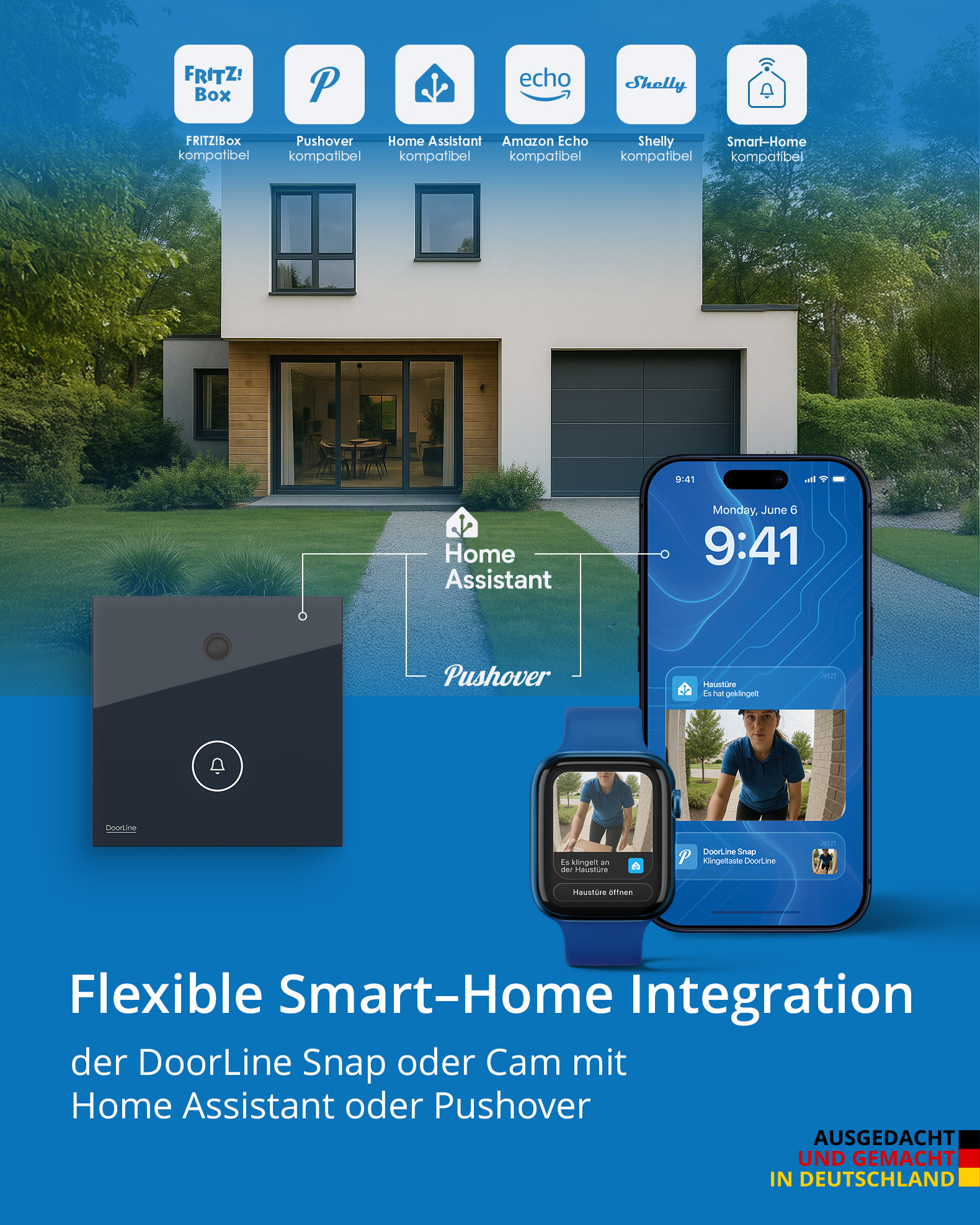 DoorLine Snap und DoorLine Cam verbinden Design, Funktion und smarte Technologie zu einem flexiblen System, das sich perfekt in Ihr Smart Home integriert. Ob als eigenständige WLAN-Türklingel (Snap) oder als Ergänzung zu bestehenden Modellen (Cam) – beide Geräte ermöglichen komfortable Video-Kommunikation, intelligente Benachrichtigungen und eine einfache Einbindung in Systeme wie Home Assistant, Alexa oder Pushover.