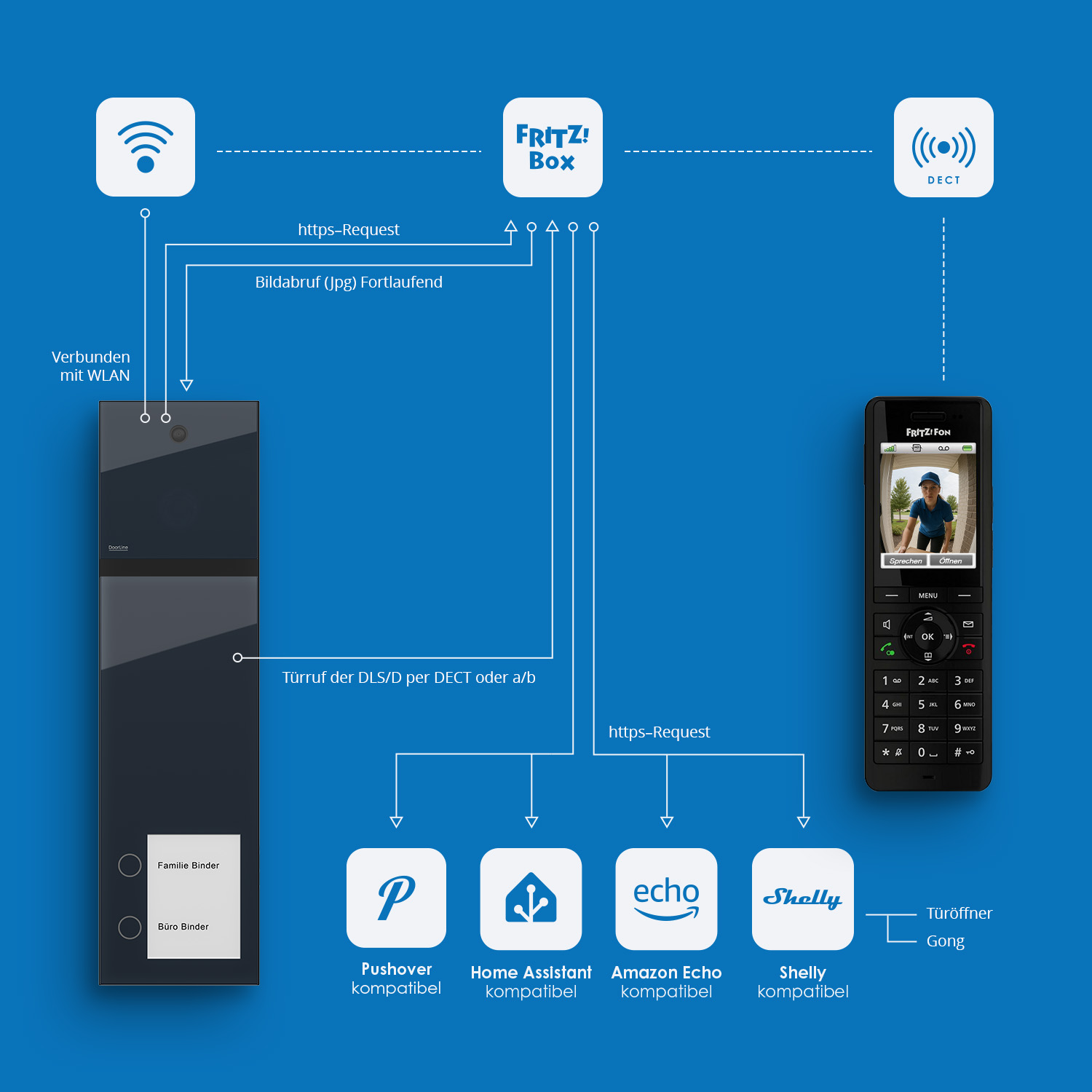 Unser Usecase zeigt, wie das System über WLAN und DECT mit der FRITZ!Box kommuniziert: Während die Slim den Klingelruf an ein FRITZ!Fon sendet, ruft der Router parallel fortlaufend Bilder (JPG) der Cam ab, sodass diese auf dem FRITZ!Fon oder FRITZ!App Fon angezeigt werden. Zusätzlich lässt sich das Kamerabild in Home Assistant, Pushover oder Alexa anzeigen – zuhause oder mit Pushover sogar unterwegs. Mittels HTTPS-Requests können ebenfalls kompatible Systeme oder Komponenten, wie z.B. ein Shelly WLAN-Schaltaktor direkt, angesteurt werden. Unsere Doorline Slim/DECT erhalten so neue Smart-Home-Funktionen – eine einfache Nachrüstlösung mit echtem Mehrwert. Also direkt die DoorLine Cam nachrüsten.